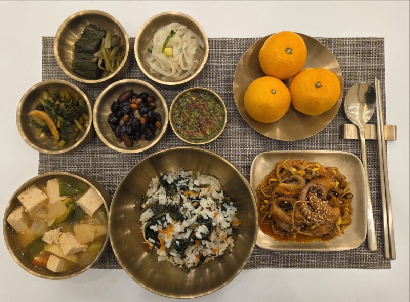 11월 19일 (한상차림) 곤드레나물밥 호박된장찌개 쭈꾸미콩나물볶음 명이나물절임 무나물 콩조림(1,4층 추가찬) 열무김치 당도선별 감귤(간식) 쭈꾸미볶음의 장점