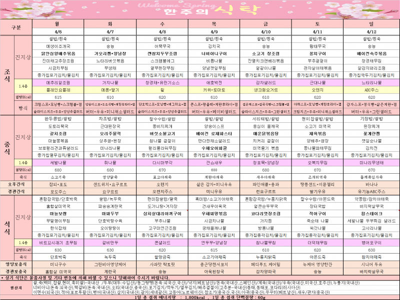4월6일~4월12일 식단표입니다.