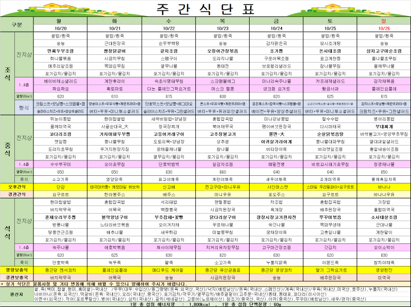10월20일~10월26일 식단표 입니다.