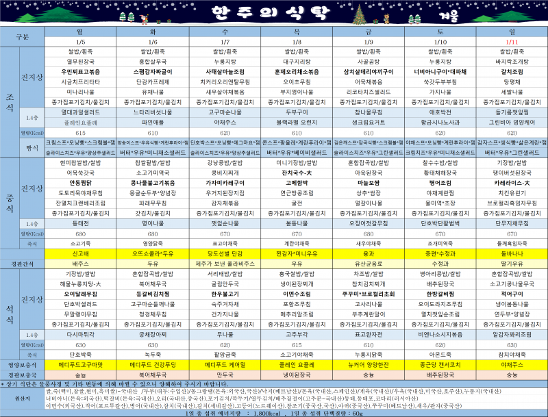 1월5일~1월11일 식단표 입니다.
